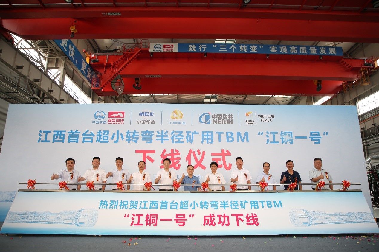 成功下线的TBM“江铜一号”,由江西中铁工程装备有限公司根据银珠山铅锌银矿地质情况有针对性设计优化制造,是江西首台超小转弯半径矿用TBM,也是国内首次采用TBM工法在井下掘进金属矿山长距离中段工程。TBM的运用,将大幅度提高银珠山项目基建井巷工程的施工效率,同时还将进一步提升井下施工的安全,改善作业面环境条件,为银珠山项目实现早日竣工投产奠定了坚实的基础。