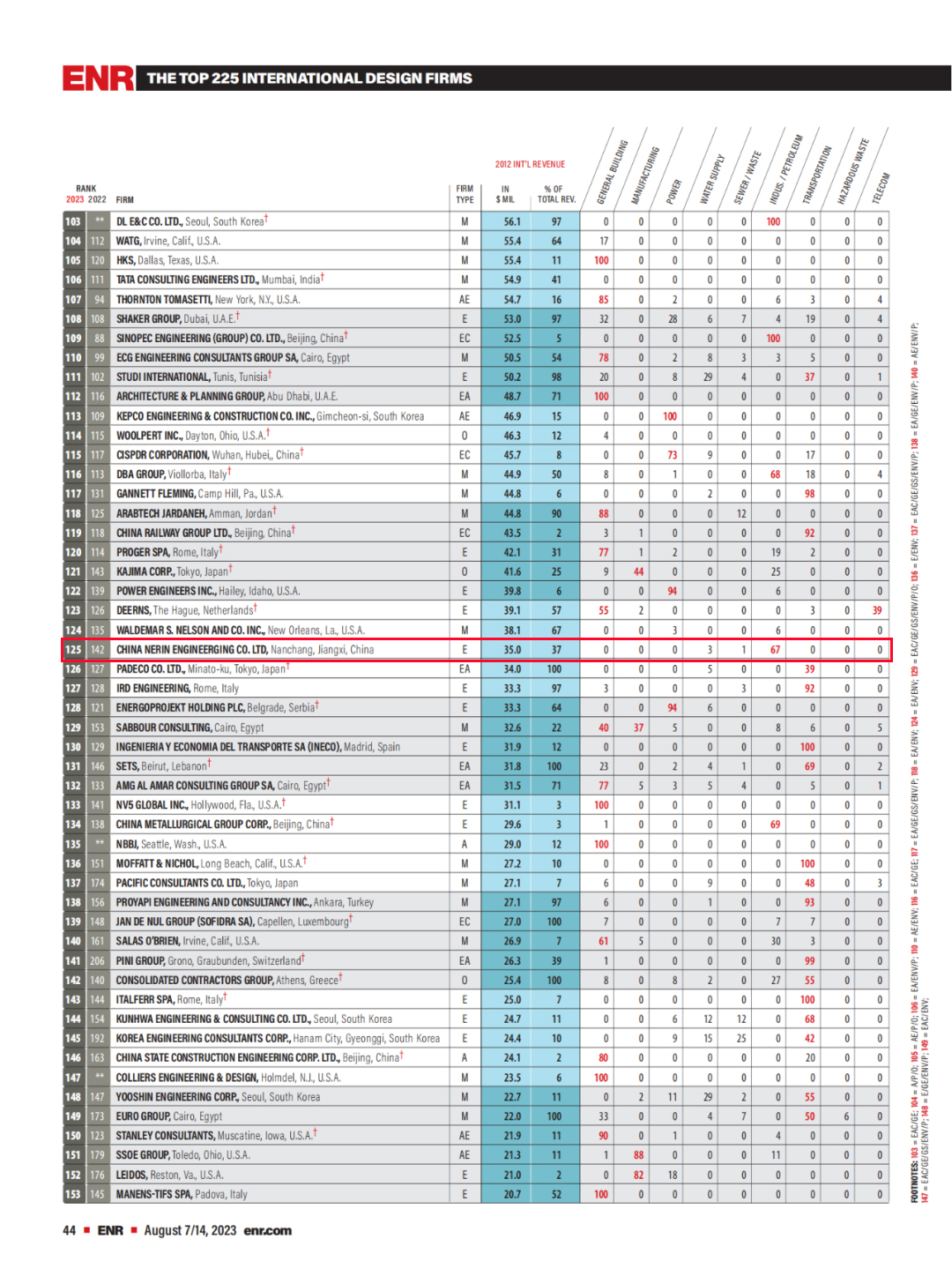 据中国对外承包工程商会官微消息,近日,2023年度美国《工程新闻记录》(ENR)“国际工程设计公司225强”和“全球工程设计公司150强”双榜发布。中国内地共有23家企业上榜“国际工程设计公司225强”,上榜企业数量与2022年度持平。其中,中国瑞林位列榜单第125位,较上一年度排名上升17位。