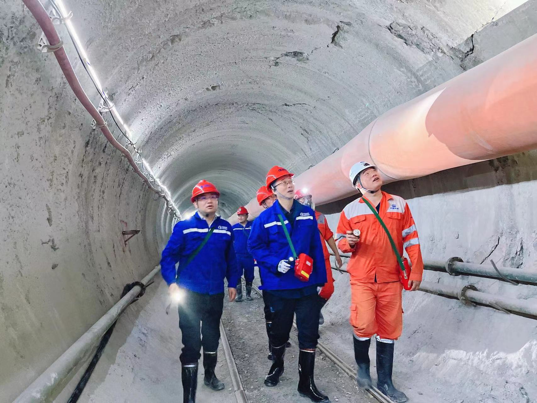 章晓波一行深入项目施工一线,实地查看了主副井建设及井下TBM盾构机施工,并听取了项目负责人有关情况汇报。在了解到银珠山项目2023年先后顺利完成了副井井塔落成、斜坡道全线精准贯通、选矿厂无负荷联动试车成功及主要设备带料联动试车成功等一系列里程碑工作后,章晓波对项目建设情况给予了肯定。