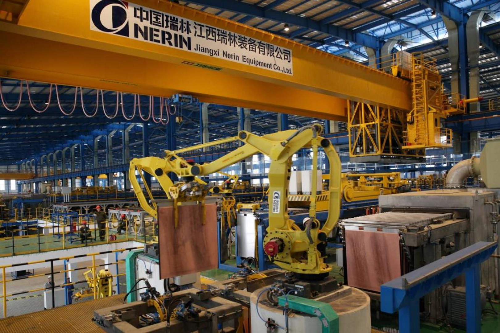 智能工厂建设方面,江铜国兴智能工厂是NDI产品深度应用的典型代表。中国瑞林团队凭借对铜冶炼工艺的精深理解,围绕“侧吹炉熔炼+多喷枪顶吹吹炼+回转式阳极炉精炼+永久不锈钢阴极电解”工艺流程,从工程设计、施工建设到生产操作、运营管理的全阶段,进行了多项优化创新,众多智能装备首次应用于铜冶炼工艺,如顶吹炉智能调枪系统、机器人阴极剥片机组、电解阳极整形机组等。统一基础平台、一体化管控中心、“侧 + 顶”专家系统、一体化生产运营管理应用系统等的综合建设,开创了有色金属冶炼智能工厂建设新模式。NDI产品对冶炼工艺流程进行全面数智化升级,通过专家系统精准优化熔炼、吹炼等环节工艺参数,显著提升生产自动化水平与产品质量;一体化生产运营管控系统实现多业务协同管理,助力企业实时掌握生产运营动态,优化生产计划和调度决策,降低运营成本。